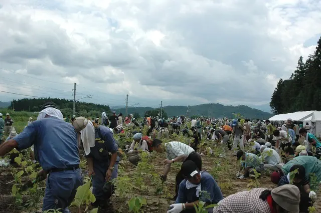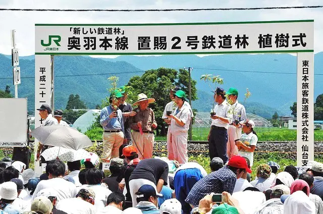 今年の植樹式は、山形県東置賜郡高畠町の奥羽本線置賜2号林で開催され、約1,100人の参加者により約1万本の苗木が植栽されました。